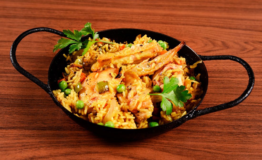 Picar el ajo y la cebolla, rehogarlos unos minutos con dos cucharadas de aceite, luego agregar las presas de pollo. Una vez que el pollo este medio cocido, agregar el morrón picado en cuadritos, las arvejas y mezclar. Esperar unos segundos y agregar el arroz rehogar todo junto y agregar el agua caliente, ½ cucharadita de sal y unas hebras de azafrán. Mezclar todo, tapar la olla y dejar cocer aproximadamente 15 minutos, luego servir colocando unos pedacitos de perejil picado.