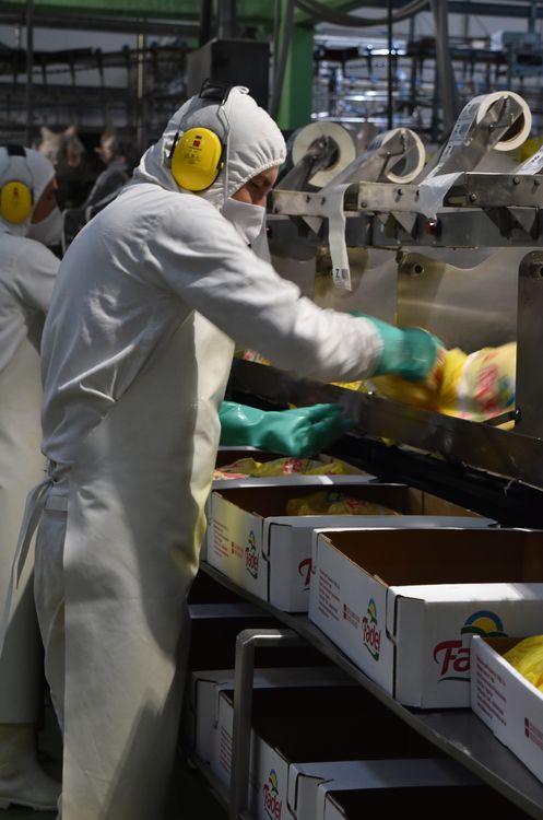 en esta etapa, el producto es congelado en forma rápida e individualmente (Individual Quick Frozen, IQF) en un Girofreezer. Para ello, el producto ingresa en un extremo del equipo de congelamiento rápido, es sometido a bajas temperaturas durante corto tiempo en su recorrido en la cinta transportadora en espiral, para finalmente abandonar el equipo, ya congelado. - Encajonado: