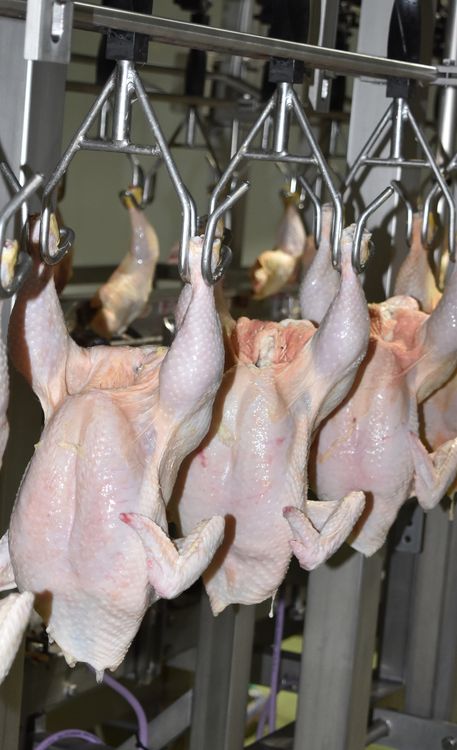 se realiza el sacrificio, y luego entran al sector pelado, donde se les retiran las plumas, y luego se transfieren automáticamente hacia otra noria. - Corte y procesado de garras y tronquitos: