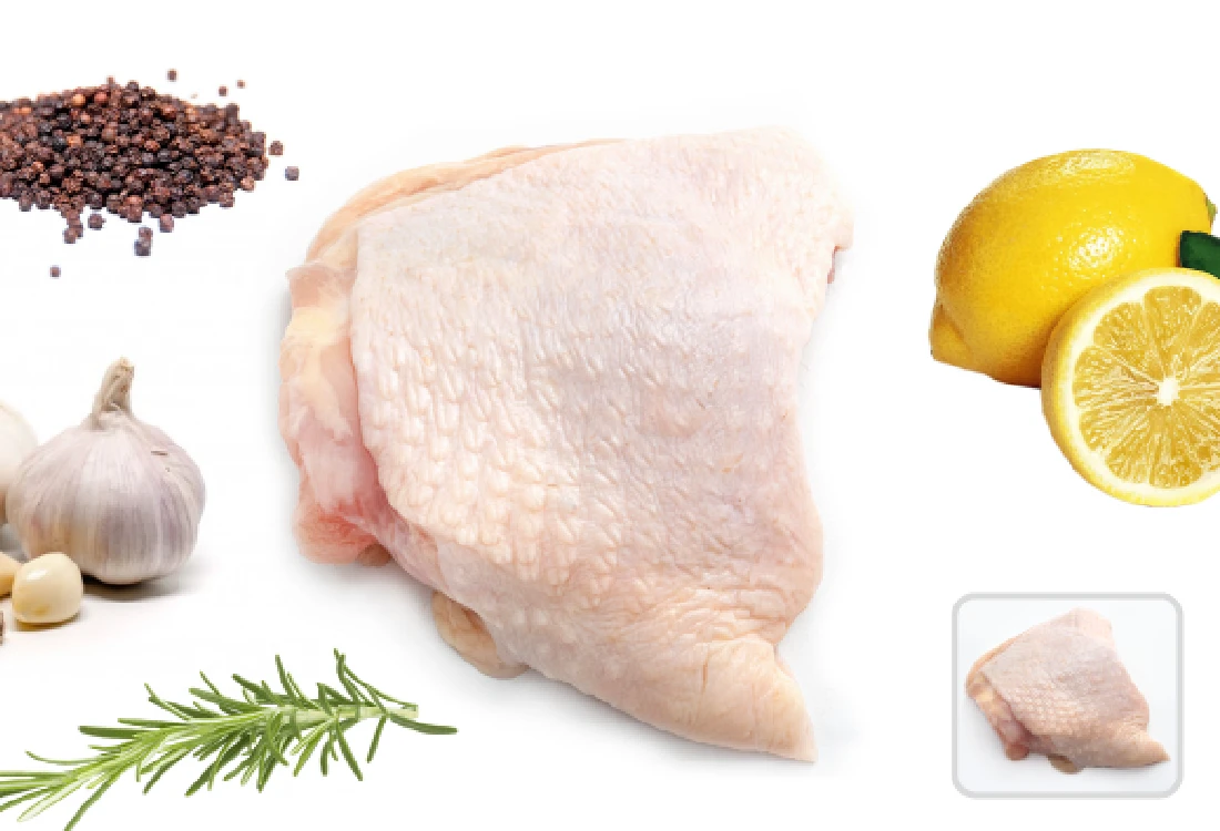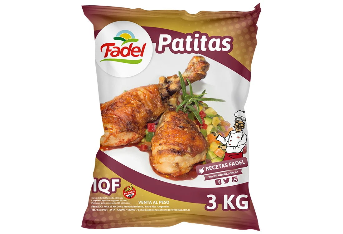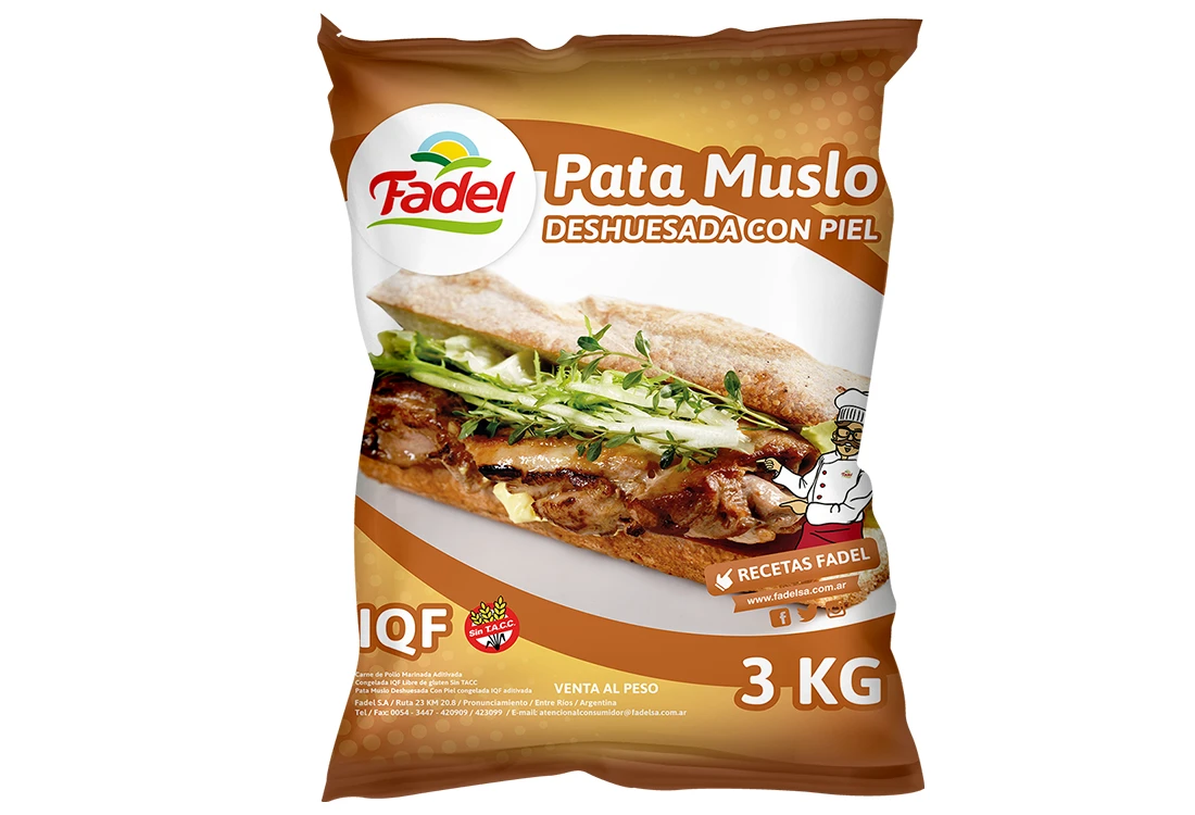 Cajas de 15 kg, fraccionada en 5 bolsas x 3kg cada una. - Pata Muslo sin cadera IQF.